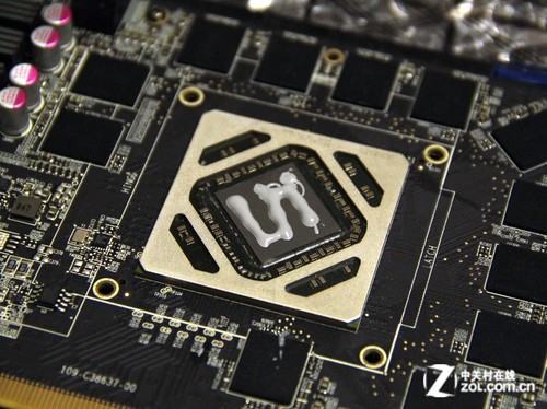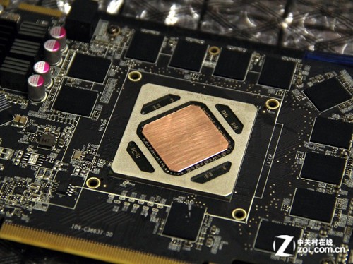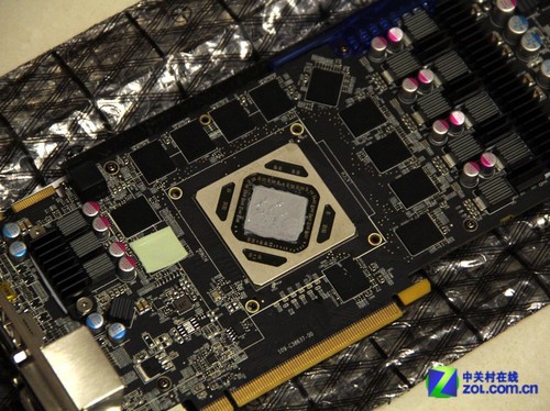我們以HD7970顯卡為例,拆下原裝顯卡散熱器,我們可以看到裸露的核心,在核心的邊緣是一個(gè)保護(hù)圈,普通顯卡核心四周高度與核心相同,但是HD7900系列較為特殊,要稍高出0.5mm,如果直接安裝其他散熱器或者水冷的話,容易造成散熱不佳的表現(xiàn)。